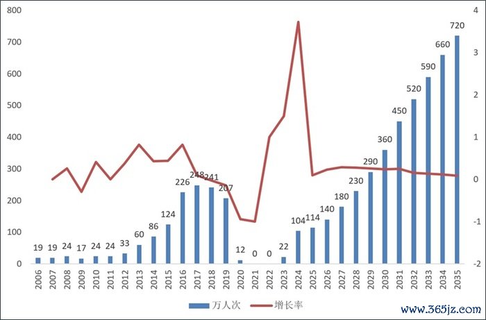 2006年-2019年,中國郵輪市場旅游人次整體上升,但2020年-2023年,中國郵輪市場停滯,2024年重啟。行業(yè)機構(gòu)預(yù)測,從2024年開始,中國郵輪市場將迅速升溫。